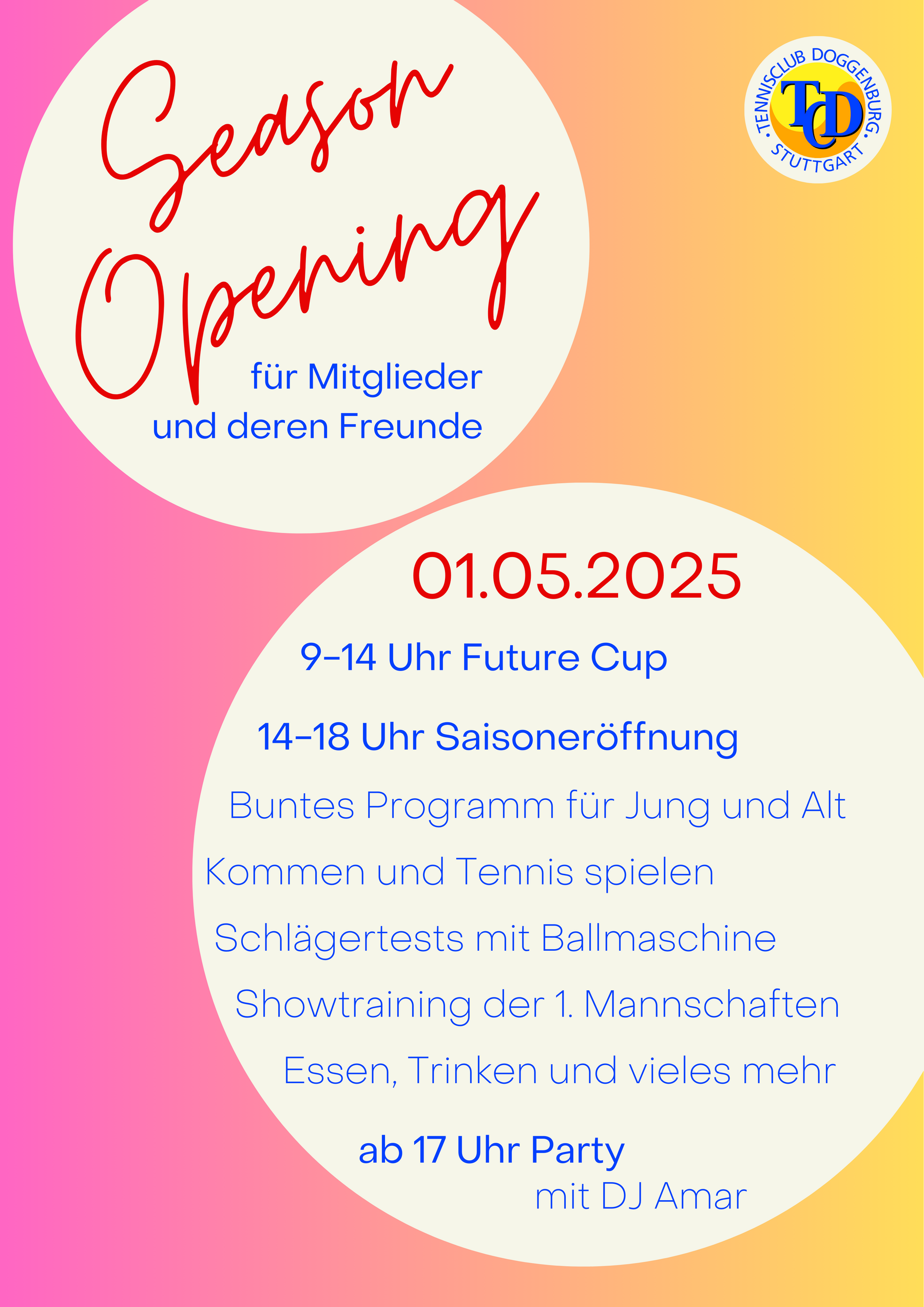 Am 01. Mai start wir ab 10 Uhr mit dem Future-Cup für unsere Nachwuchstalente, ab 14 Uhr laden wir alle Neumitglieder & Interessierten zum Tag der offenen Tür ein, und ab 17 Uhr startet dann die große DJ-Party für alle Clubmitglieder und Freunde. Dazu gibt es ein buntes Rahmenprogramm: Tennisschläger-Teststation, Fashion-Pop-Up von ace:clay, Showtraining, Kinderspielecke der UrbanKidsAcademy und eine tolle Tombola.