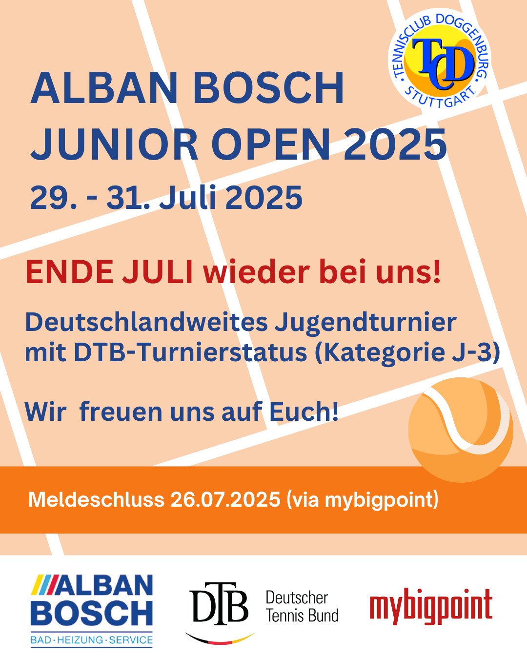 Vom 29.-31.07.2025 finden beim TCD die ALBAN BOSCH JUNIOR OPEN 2025 statt!